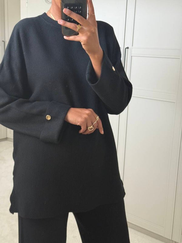 - Trui is met een ronde hals en bij de mouwen bewerkt met goude knopen voor extra detail.