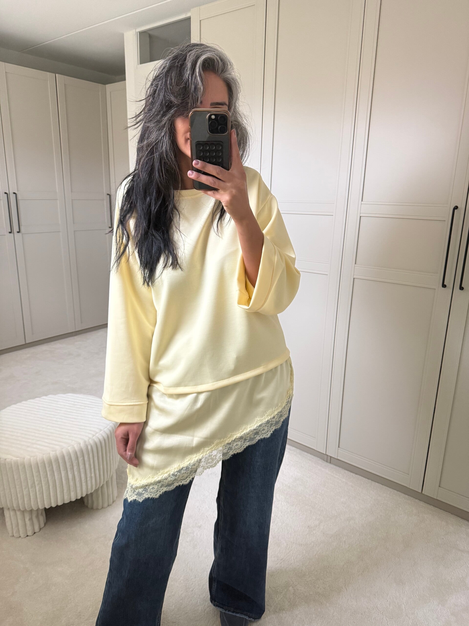 Trui met kant dicht gestikt